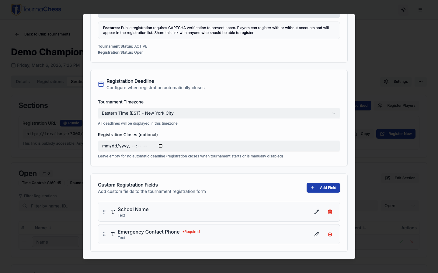 Whether you are running a free club night or a paid weekend Swiss, TournaChess gives you flexible tools to manage how players sign up and how you collect entry fees. This guide covers tournament registration -- from public sign-up pages and custom fields to Stripe-powered payment processing and notification preferences.