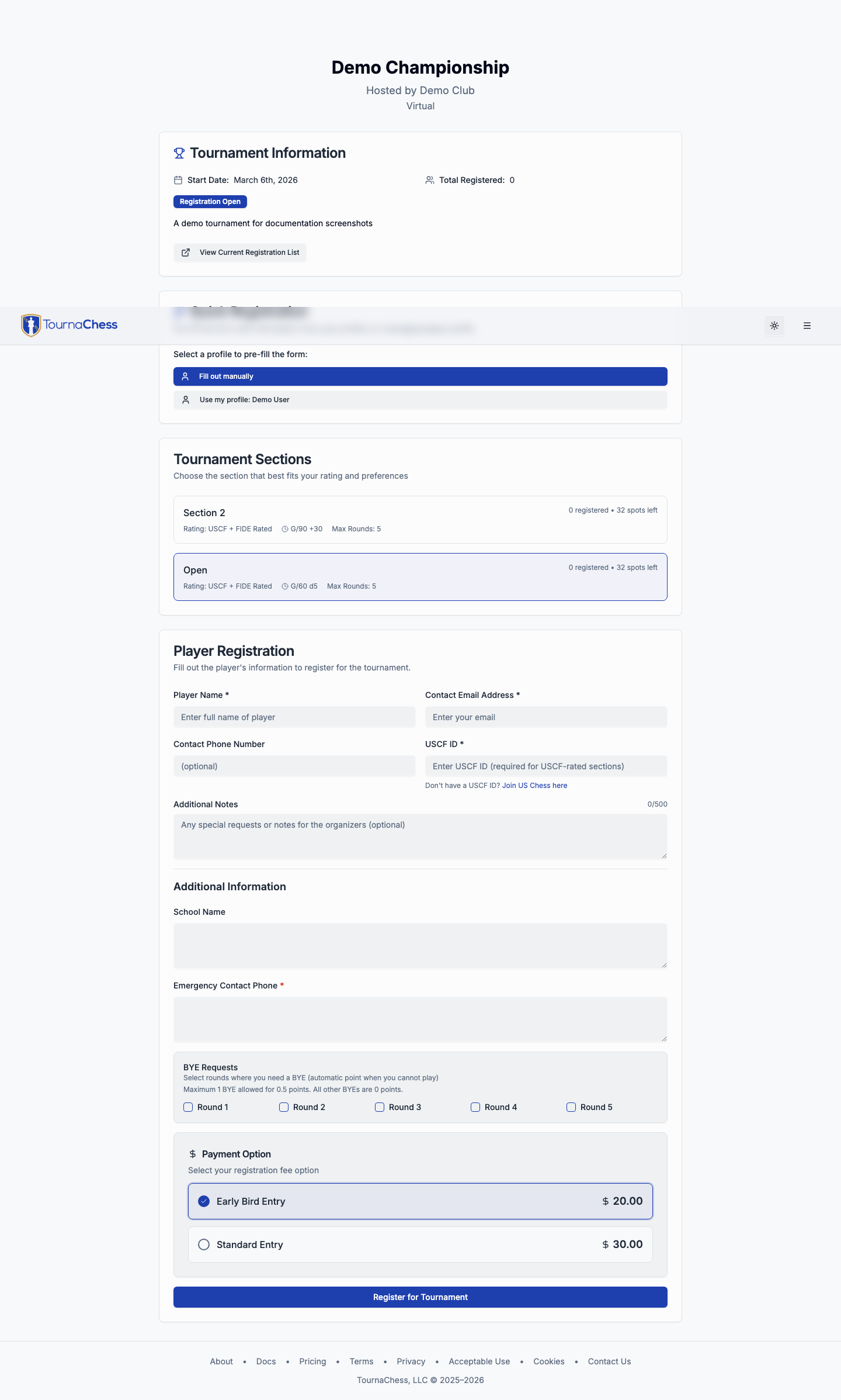 - Player information -- Name, email, and optional USCF or FIDE ID. Logged-in users have this pre-filled from their account.